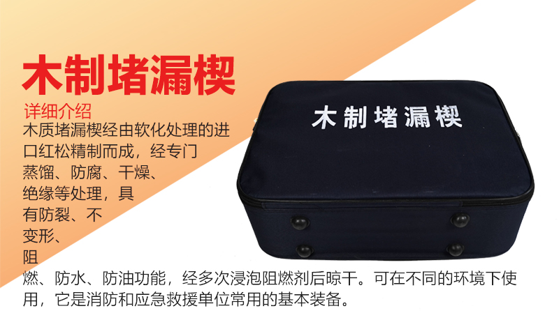 ●KJ-2木質堵漏楔(木制堵漏楔)經由軟化處理的進口紅松精制而成,經專門蒸餾、防腐、干燥、絕緣等處理,具有防裂、不變形、阻燃、防水、防油功能,經多次浸泡阻燃劑后晾干。可在不同的環(huán)境下使用,它是消防和應急救援單位最常用的基本裝備。