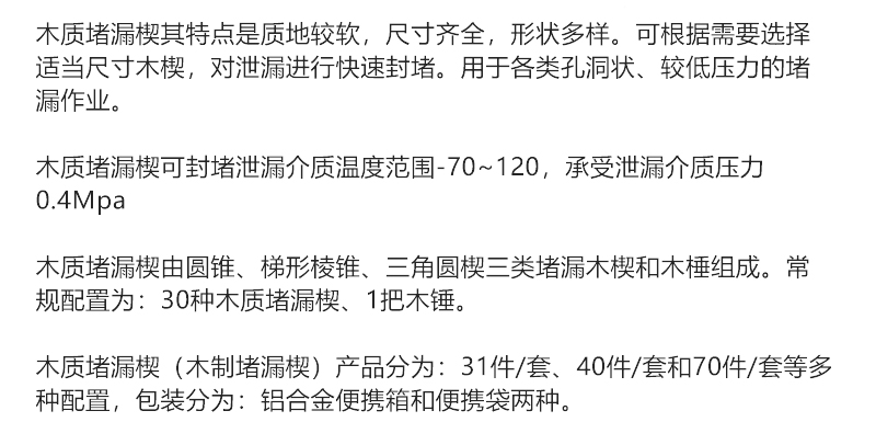 ●KJ-2木質堵漏楔(木制堵漏楔)由10件圓錐、10件棱錐、8件圓楔三類堵漏木楔和木棰組成。配置為:28件木質堵漏楔、1把木錘、鋁合金工具箱一個。