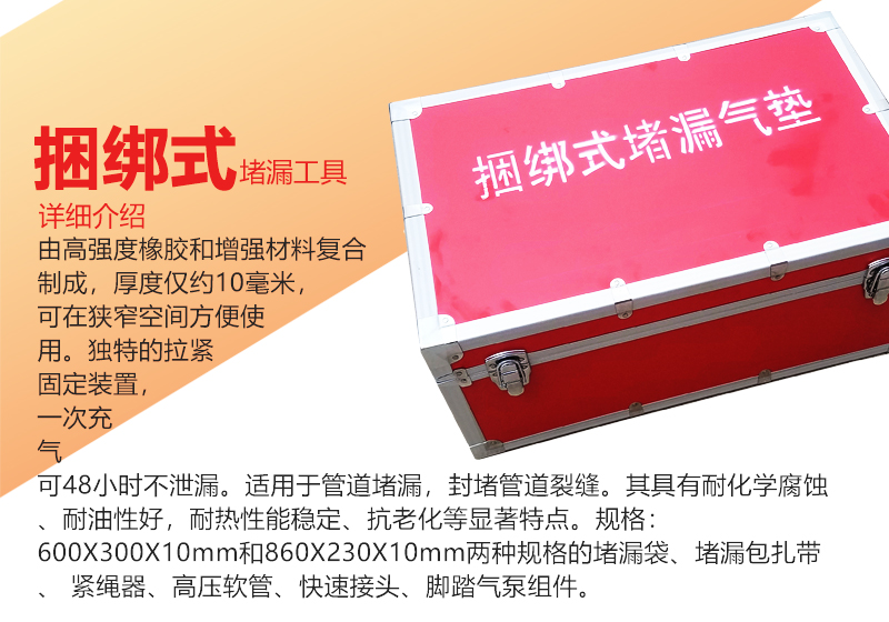 由高強度橡膠和增強材料復合制成,厚度小于15毫米,適用于封堵罐狀類容器窄縫狀裂口及孔洞。其具有耐化學腐蝕、耐油性好,耐熱性能穩(wěn)定、抗老化等顯著特點。是消防搶險救援必備堵漏工具。本產品 廣泛應用于消防、石化、電力等系統(tǒng)搶險救援,專用堵漏器材