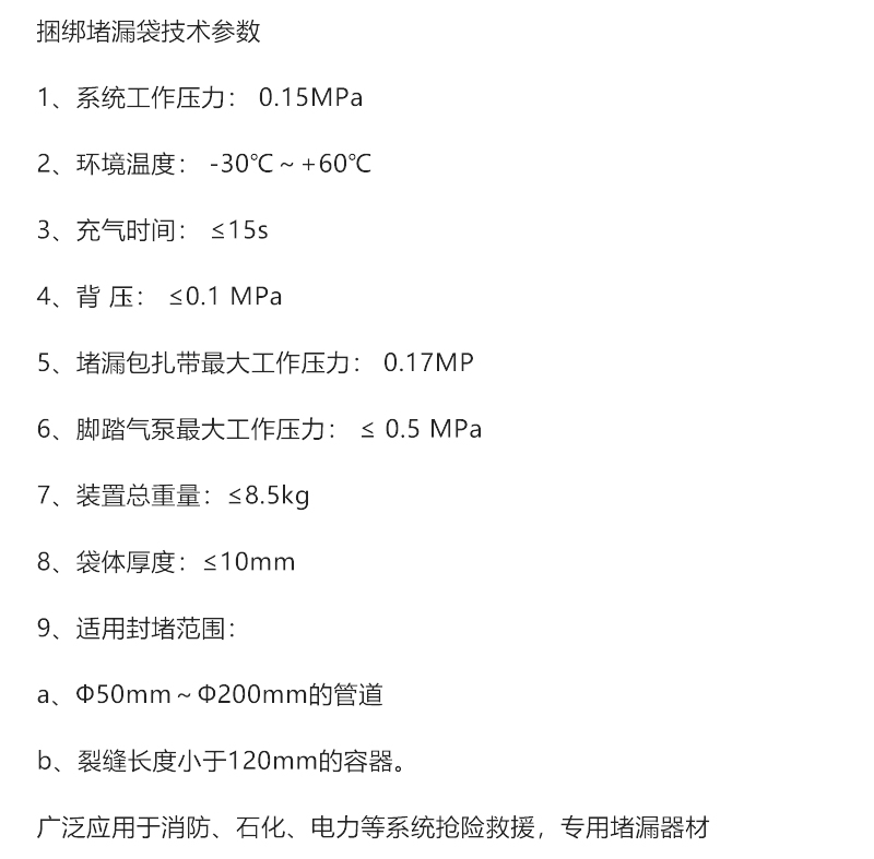 5、堵漏包最大工作壓力:≤0.4MPa