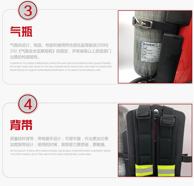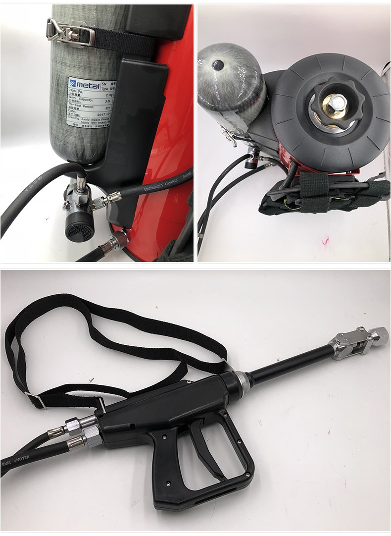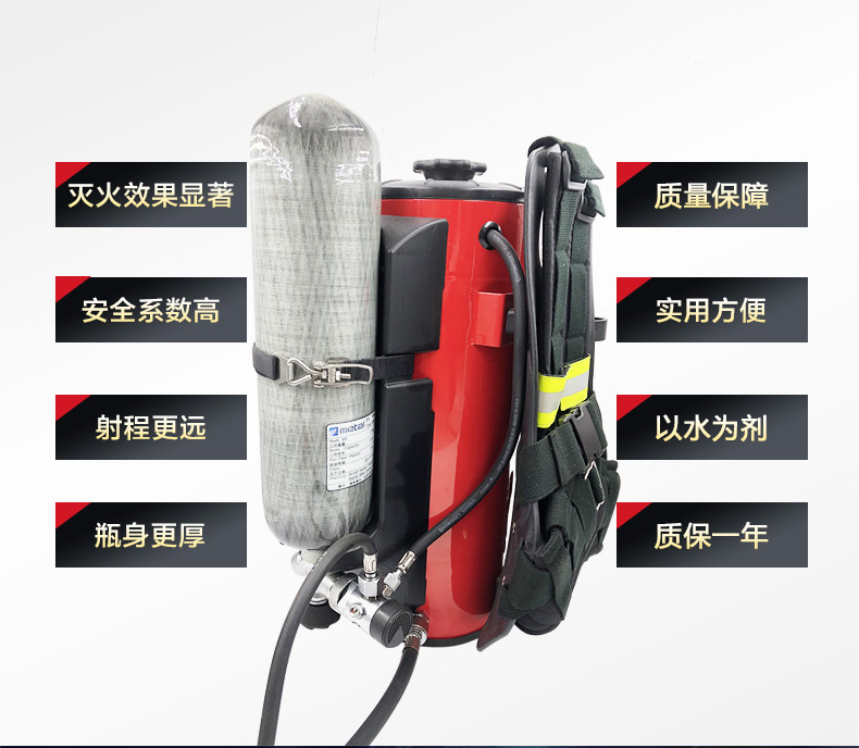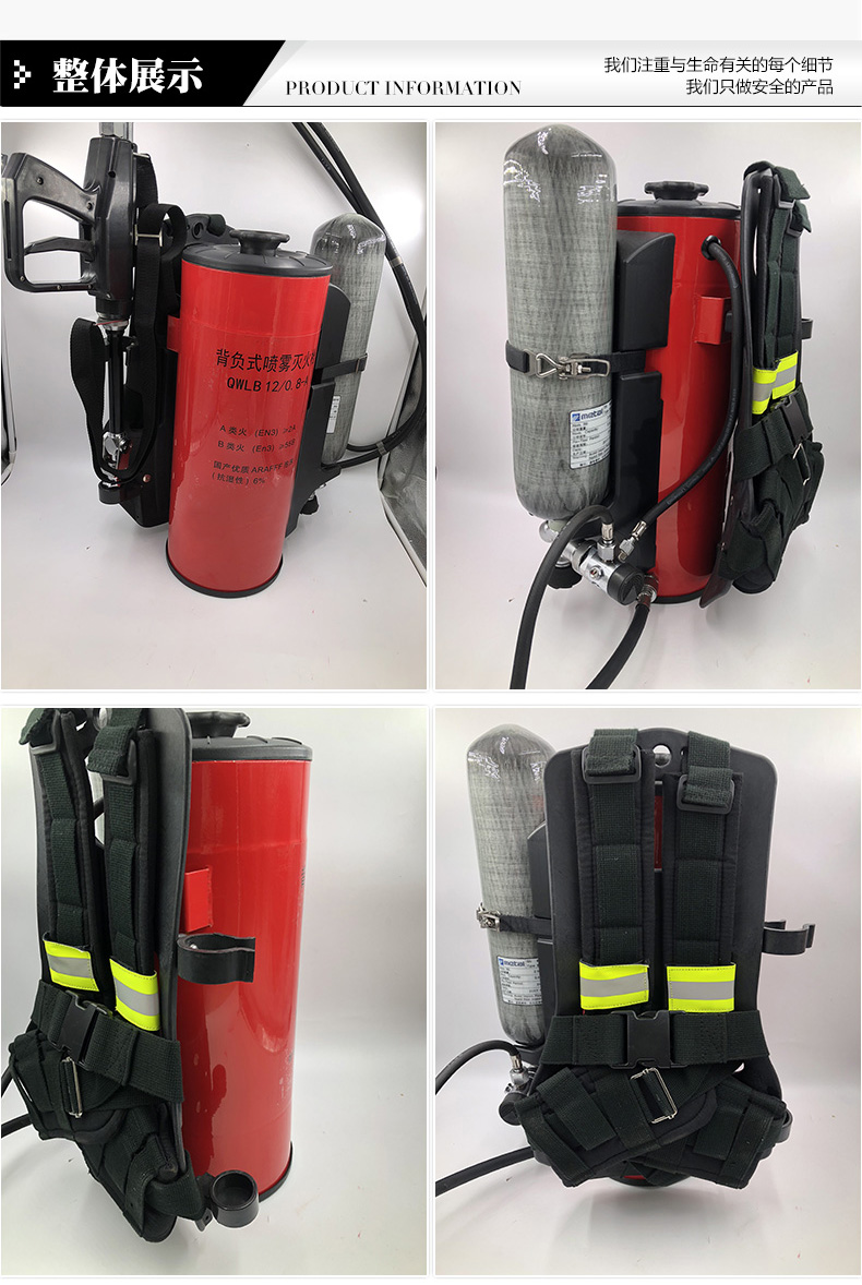 本裝置是將空氣呼吸器和細(xì)水霧滅火裝置進(jìn)行有機(jī)組合,既能滿足滅火操作人員方便攜帶進(jìn)入火災(zāi)現(xiàn)場進(jìn)行滅火,又能滿足呼吸需要,且重量配置合理具有背負(fù)舒適,操作簡單,維護(hù)方便等特點(diǎn)。