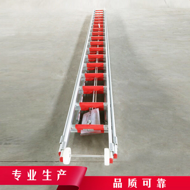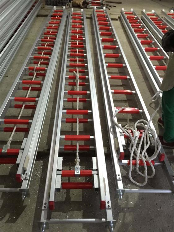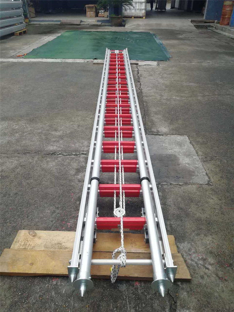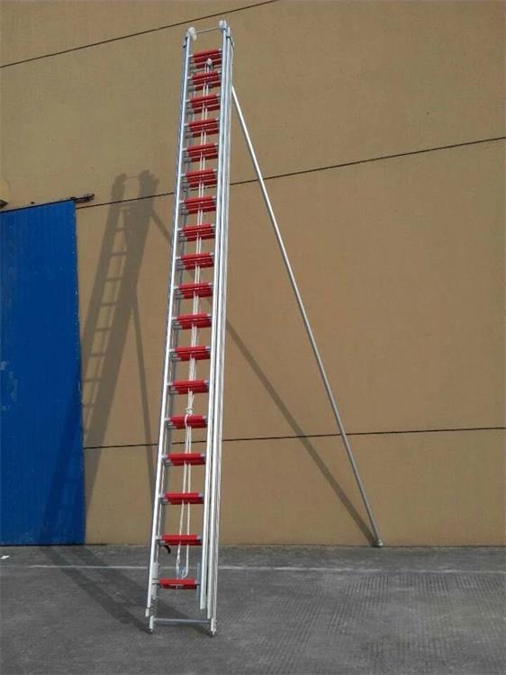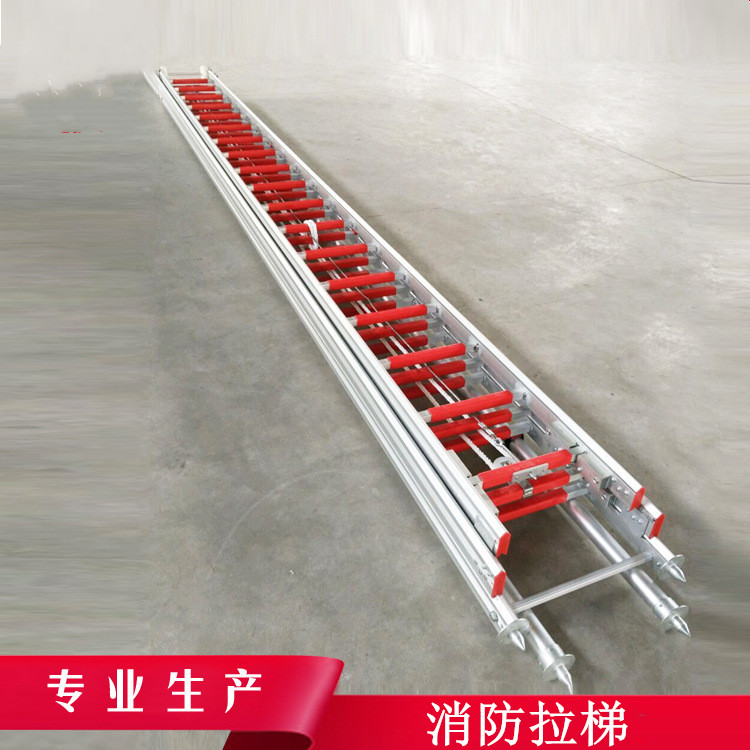 選用高強鋁合金材料制成。主要用于中小城市無舉高車、普通梯又達不到高度的場所。是消防隊員登高救人,撲滅火災時必備工具。也適用于工廠、機關(guān)、部隊、商店、電工、安裝工、市政建設(shè)人員登高作業(yè),其用途廣泛。該梯由上、中、下三節(jié)組成,下節(jié)梯安裝有支撐桿,用于增加穩(wěn)定性,下節(jié)梯和中節(jié)梯的側(cè)板上裝有滑槽,中節(jié)梯和上節(jié)梯的側(cè)板下端裝有導板,可有效保證中節(jié)梯沿下節(jié)梯滑動、上節(jié)梯沿中節(jié)梯滑動,上節(jié)梯上端裝有輪子,可方便拉梯的展開和縮合,拉梯的升降裝置由滑輪、拉繩和撐腳組成,在展開和縮合過程中,可保證限位安全可靠。